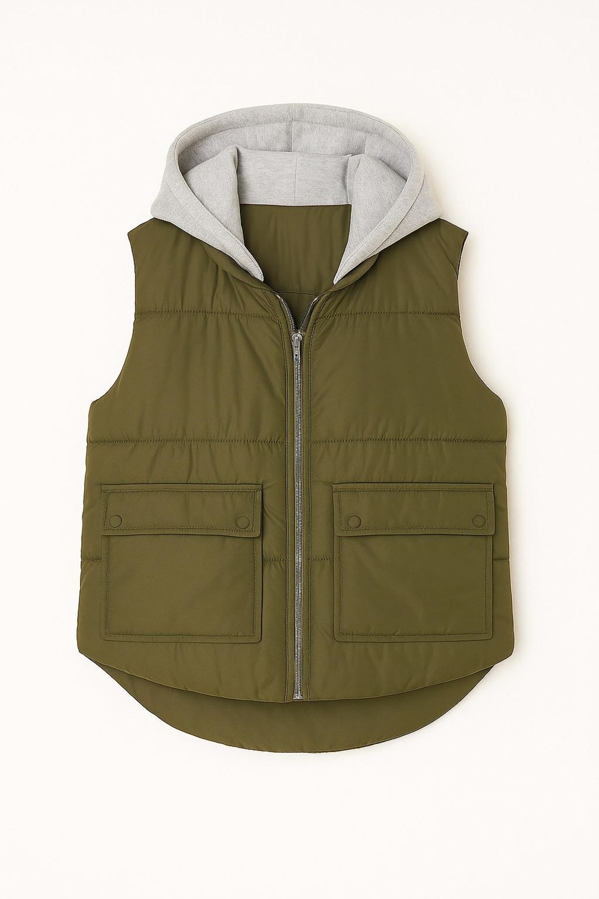 Gri Kapüşonlu Kısa Şişme Yelek - Haki