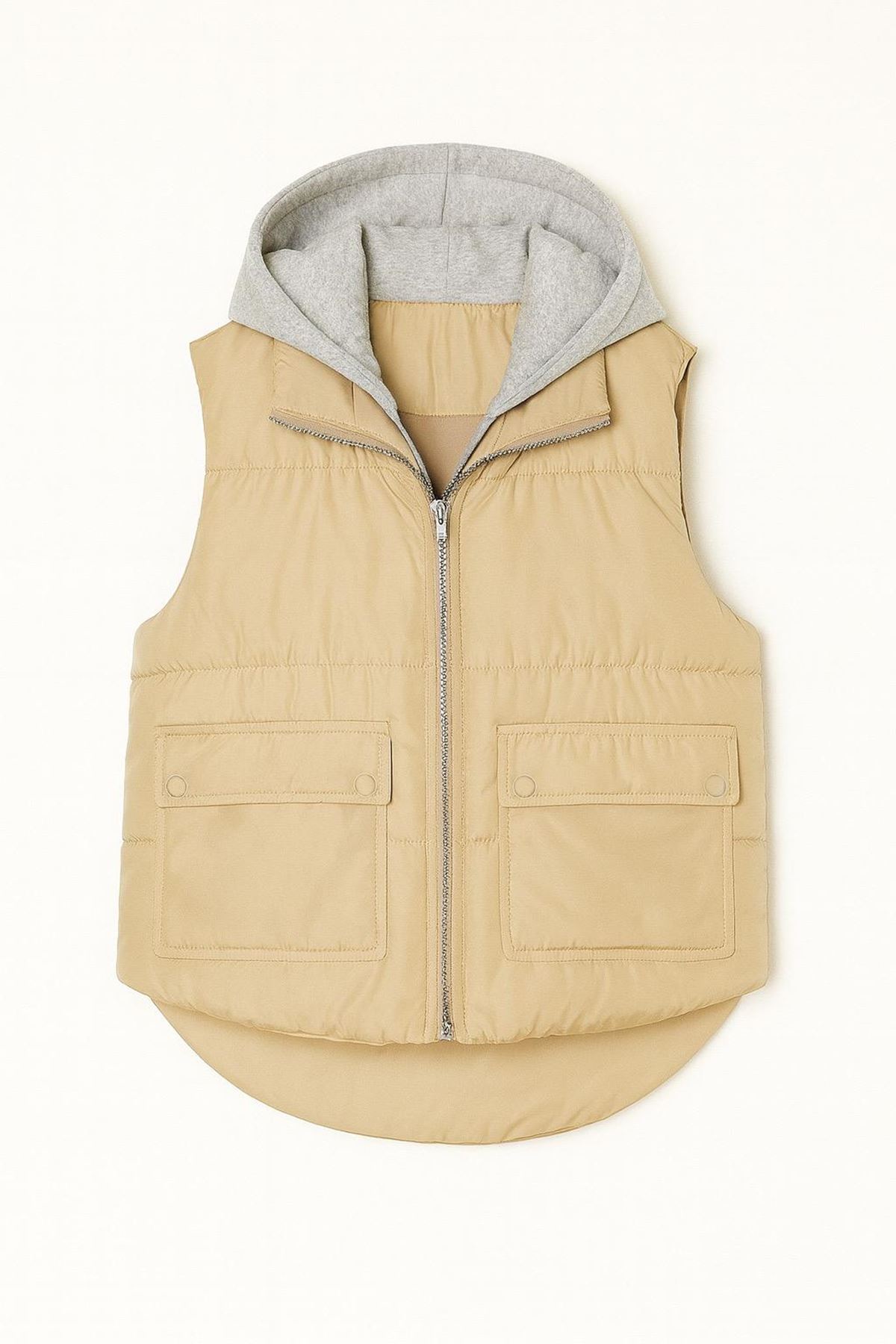 Gri Kapüşonlu Kısa Şişme Yelek - Krem
